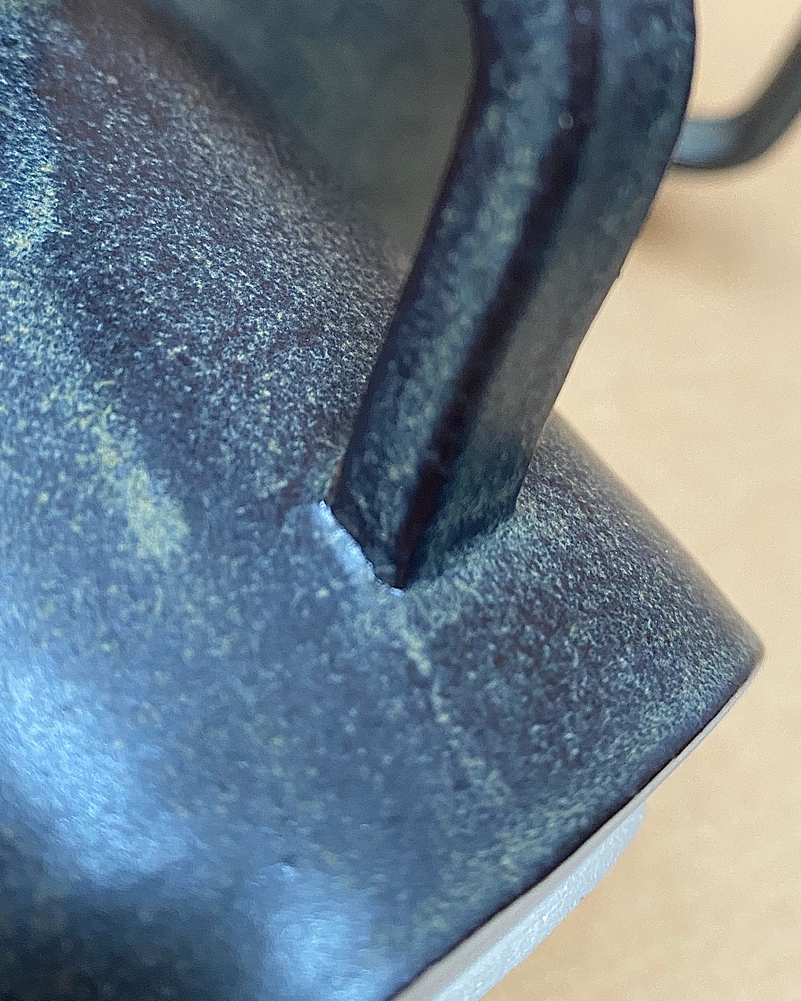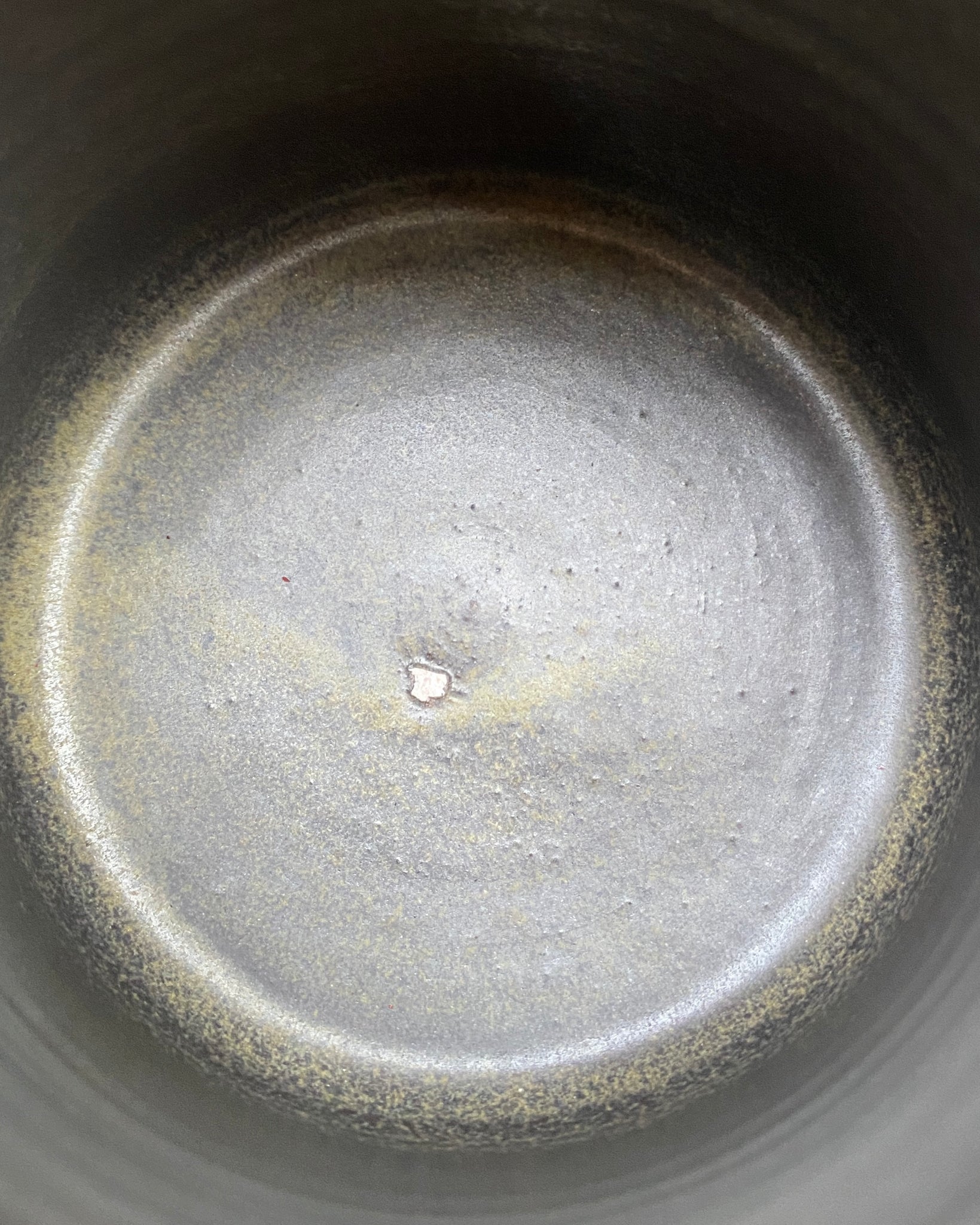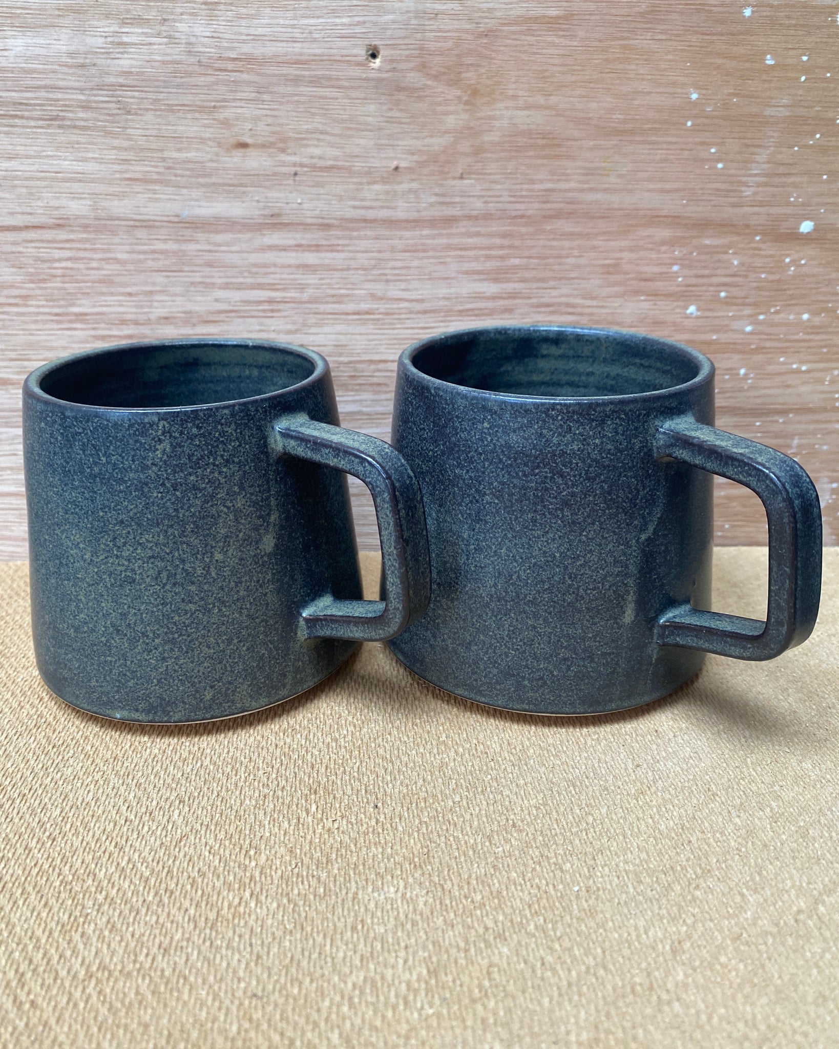 2 cups glazed in charcoal black. Crack in handle joint in one and blip in interior surface of the other.